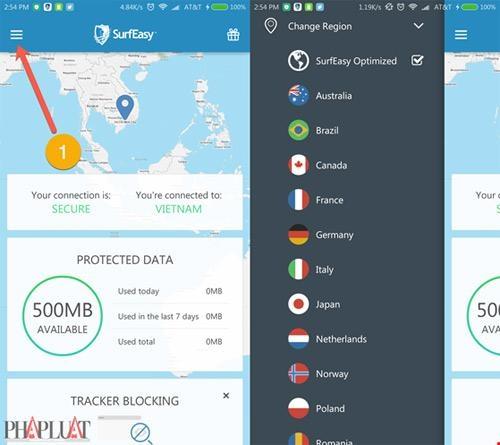 Android: Cài đặt ứng dụng SurfEasy tại https://goo.gl/khC08b. Khi hoàn tất, bạn hãy tạo cho mình một tài khoản miễn phí, truy cập vào menu của ứng dụng ở góc trên bên trái, chọn Change Region để lựa chọn máy chủ VPN tương ứng (lưu ý, người dùng nên chọn các máy chủ có vị trí ở gần để có tốc độ tốt nhất).