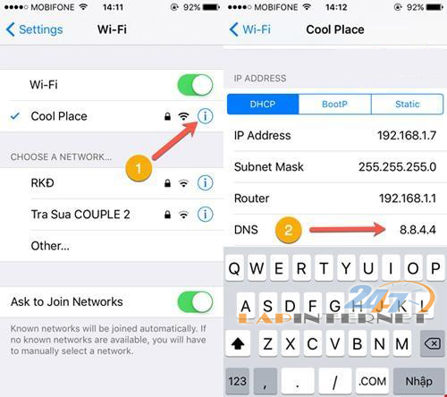 Với thiết bị iOS: Đối với các thiết bị iOS (iPhone, iPad hoặc iPod), bạn hãy vào Settings > Wi-Fi, chạm vào biểu tượng chữ “i” ở cuối tên mạng, sau đó kéo xuống bên dưới và cấu hình các thông số tương ứng tại mục DNS. Ví dụ, Google DNS (8.8.8.8, 8.8.4.4), Open DNS (208.67.222.222, 208.67.220.220)…