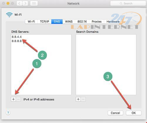 Với Mac: Để thay đổi DNS trên Mac, bạn bấm vào biểu tượng Wi-Fi trên thanh thông báo, chọn Open Network Preferences > Advanced > DNS. Tiếp theo, bạn hãy kích vào biểu tượng dấu cộng, nhập đầy đủ các thông tin tương ứng và nhấn Apply để lưu lại.
