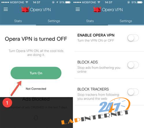 iOS: Đầu tiên, bạn hãy cài đặt ứng dụng Opera VPN (miễn phí hoàn toàn) tại địa chỉ https://goo.gl/McEsv0. Khi hoàn tất, người dùng chỉ cần làm theo các bước hướng dẫn và nhấn Turn On để bật VPN. Trong phần Settings, bạn có thể thiết lập thêm tính năng chặn quảng cáo (Block ads), ngăn chặn theo dõi (Block trackers)…