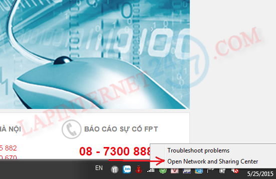 Bước 1 : Click chuột phải vào biểu tượng mạng internet wifi sau đó chọn “Open Network And Sharing Center”