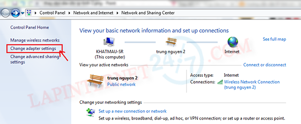 Bước 2 : sau đó bạn chọn “Change Adapter settings”