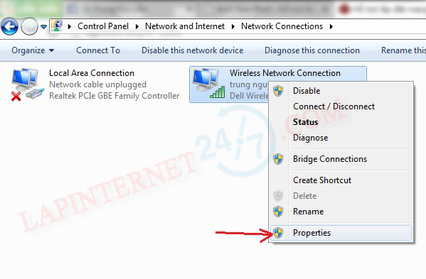 Bước 3 : Click chuột phải vào “Wireless Network Connection ” rồi chọn “Properties” sau đó click đúp vào “Internet Protocol Version 4 (TCP/IPv4)”