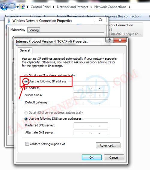 Bước 4 : Click vào “Use the following IP address”