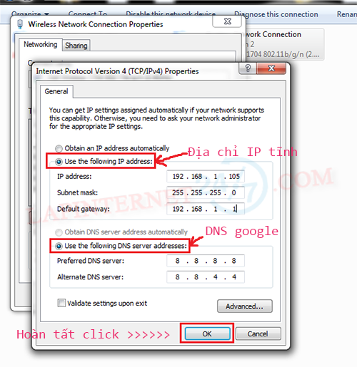 * Để thay đổi DNS của google bạn chọn “Use the folowing DNS” và điền các giá trị tương ứng là 8.8.8.8 và 8.8.4.4 sau đó bấm OK