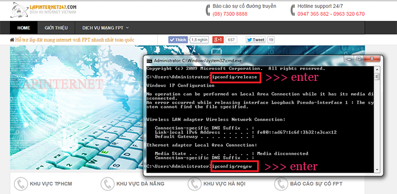 Các bạn gõ dòng lệnh sau vào CMD nhé : ipconfig/release sau đó ấn Enter để chạy, tiếp tục gõ lệnh ipconfig/renew sau đó ấn Enter.